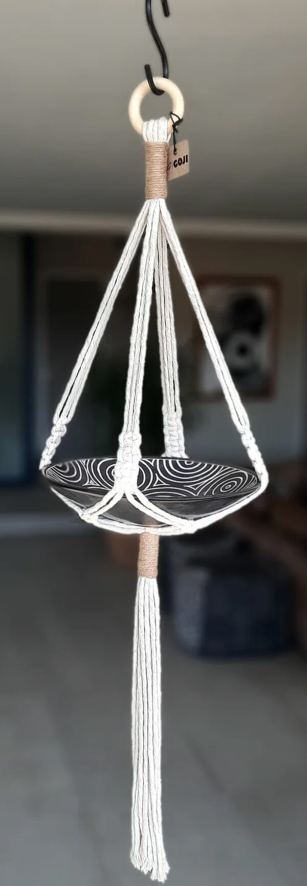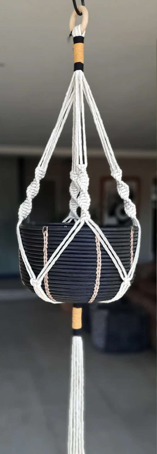 Made from Eco String, decorated with natural beads and attached to a 6cm natural jelutong wooden ring. Can be used to display pot plants, decorative vases, plates, trays or ornaments and is suitable for use on patios and indoors. Can be hand washed in cold water with non-detergent soap. Drip dry in shade. Pictured with 28cm diameter pot. Best suits vessel size between 20 - 40cm. Product does not include potsSingle Tier Macrame | Black & Mustard