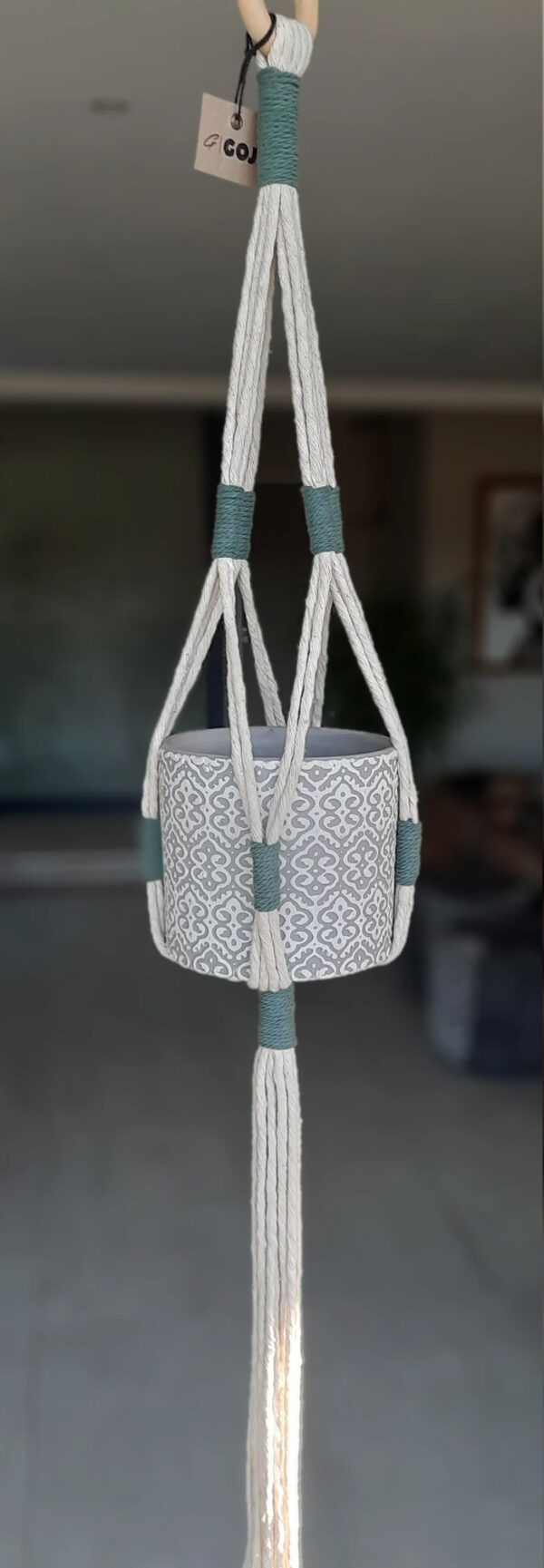 Made from 100% natural cotton with jute accents and attached to a 6cm natural jelutong wooden ring. Can be used to display pot plants, decorative vases, plates, trays or ornaments and is suitable for use on patios and indoors. Pictured with 13cm diameter pot. Best suits a small vessel between 10 & 20cm. Product does not include pots.Single Tier Macrame | Sage